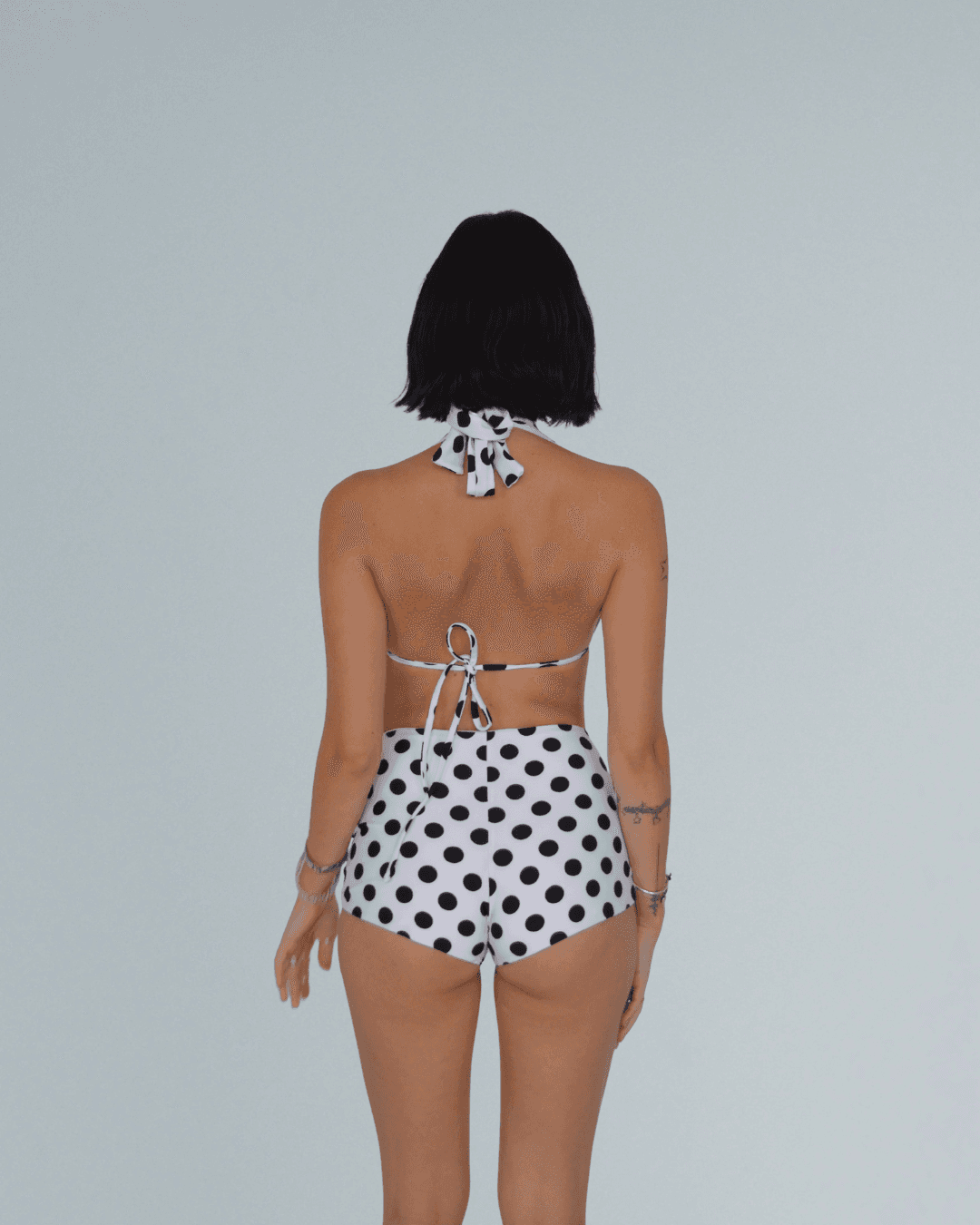 A modern take on a retro classic. This halter bikini top in bold black-and-white polka dots blends playful charm with a flattering fit.