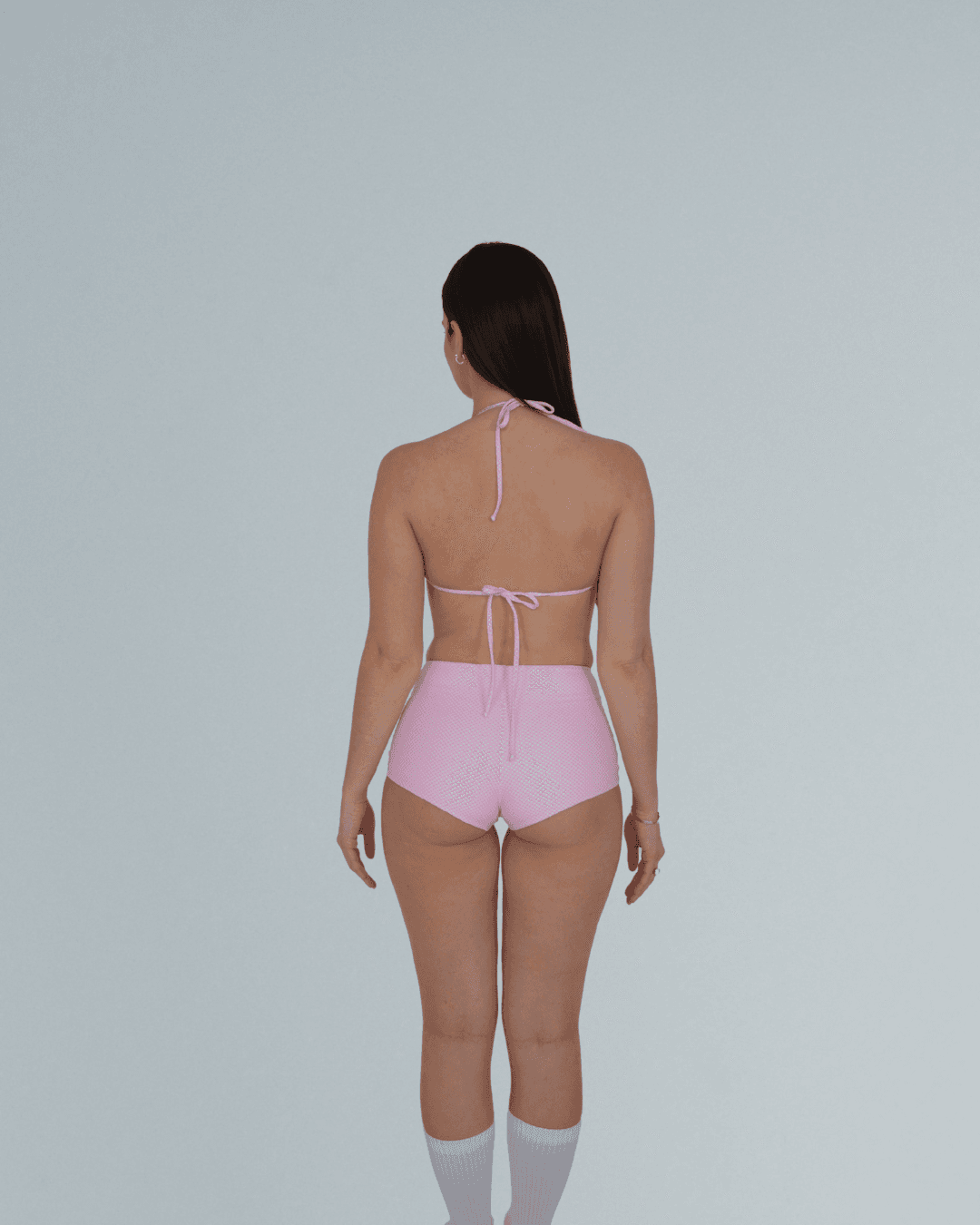 Pink gingham, detailed with a subtle white bow. Flattering and feminine.