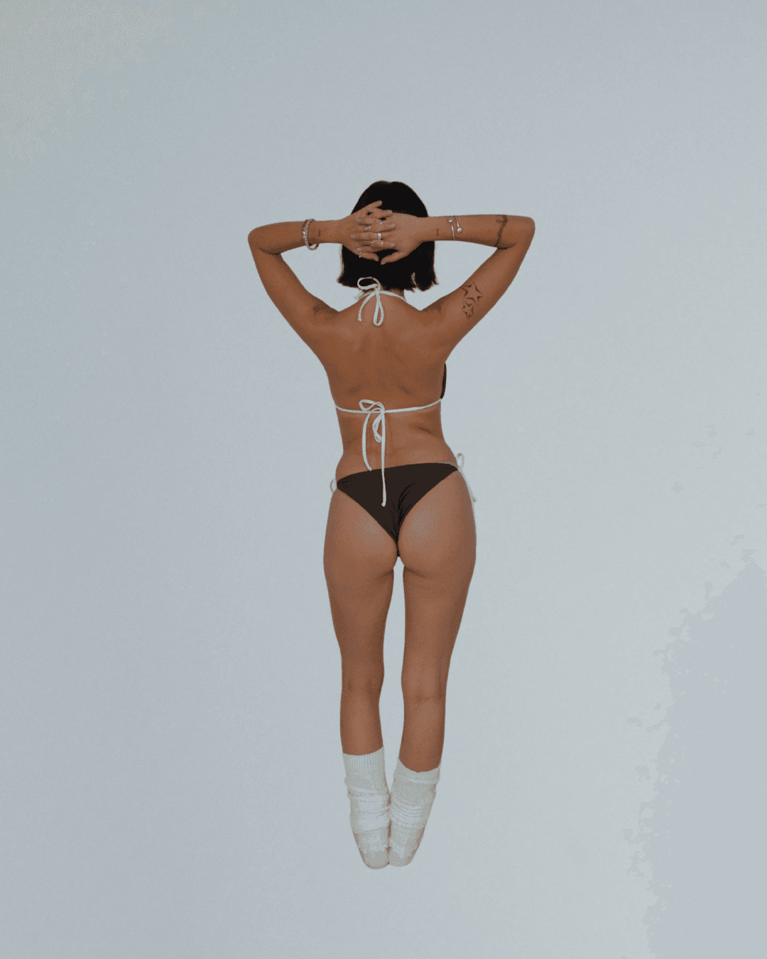 A cream and espresso brown statement, finished with subtle cream bows on each side. Pair it with the classic triangle bikini top for a look that’s both soft and striking.
