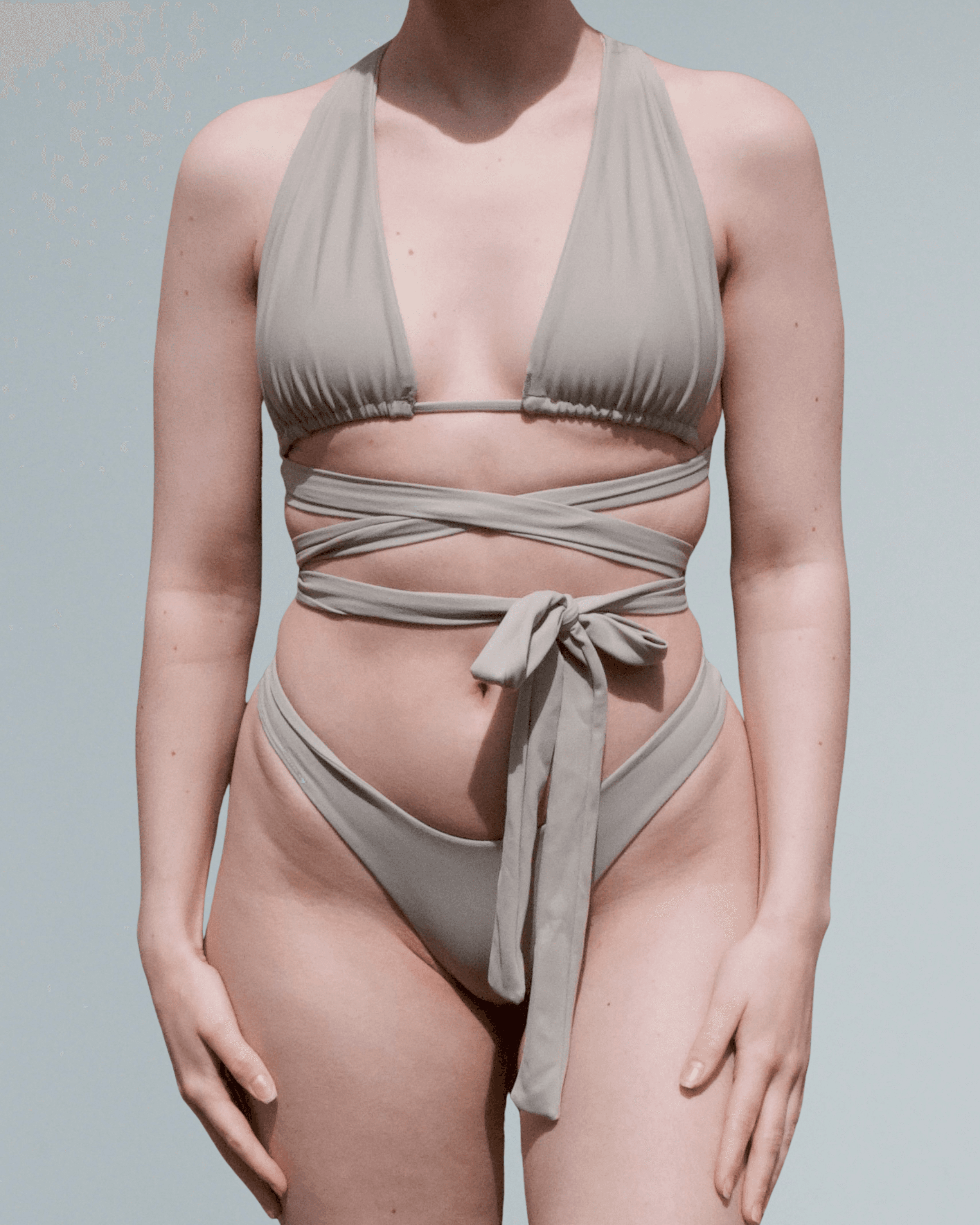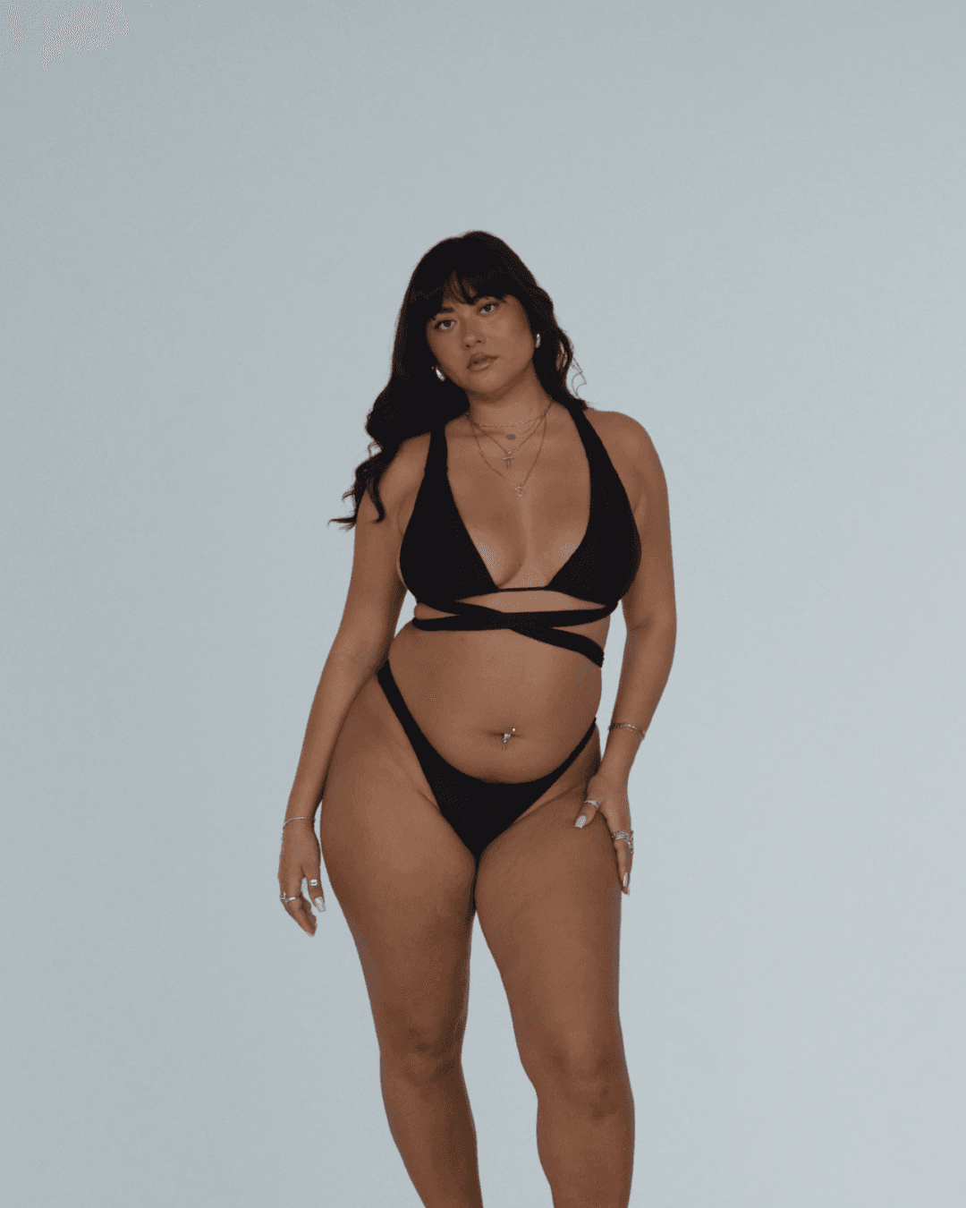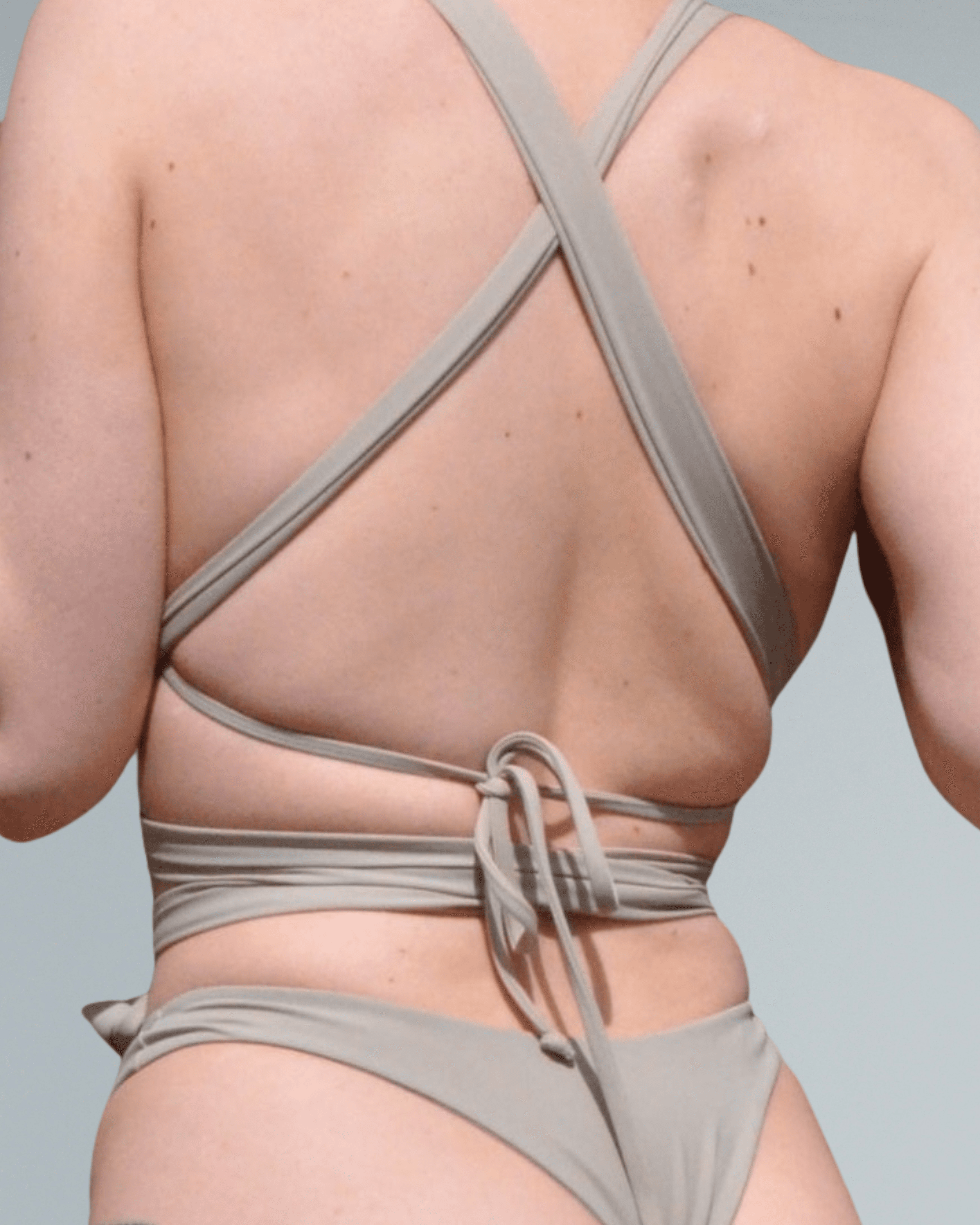 This eye catching top has ultra long straps to wrap around the body. Easy to adjust, super flattering, and supportive. Criss-cross detailing in the back. Pictured: wrap top and minimal bottoms in a size small.